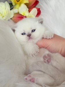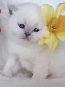 At just a few months old, Evelyn already showcases the hallmark traits of her breed. Her short, dense fur is wonderfully soft, while her round face, chubby cheeks, and large expressive eyes give her a sweet and tender look full of warmth. Her cuddly and friendly temperament makes her an ideal companion for cozy homes and loving families.