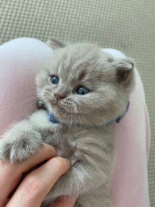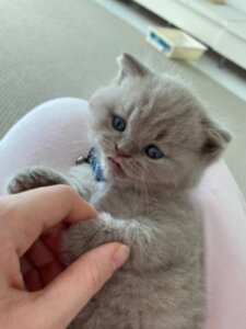 Despite being young, Mik already showcases the classic features of the British Shorthair kittens. His short, plush coat, round face with chubby cheeks, and large, expressive eyes make him stand out.