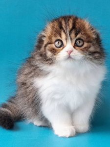 At just a few months old, Xan already displays all the hallmark traits of the Highland Fold kittens β adorable folded ears, a plush coat, and a round, expressive face that exudes warmth and cuteness.