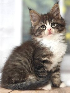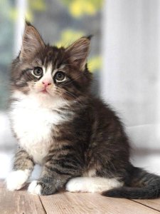 Even at just a few months old, Kay is already showing the classic features of the Maine Coon breed. Her luxurious long fur gives her a graceful and fluffy look, while her tufted ears and long, bushy tail add to her majestic appearance. Her bright green eyes shine with curiosity and intelligence.