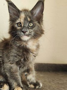 Ornella’s tufted ears, fluffy tail, and expressive green eyes beautifully embody the sophistication of Maine Coon kittens. Even at just a few months old, she displays the striking features that make this breed so beloved. Her playful curiosity adds to her charm, making every moment with Ornella pleasurable.