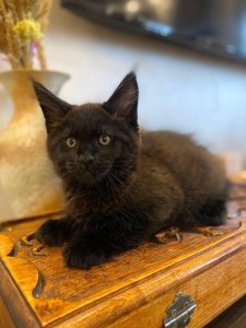 Even at just a few months old, Volad is already showcasing the beloved traits of Maine Coon kittens. His vibrant green eyes gleam with curiosity, while his affectionate nature and love for adventure make him a wonderful addition to any family.