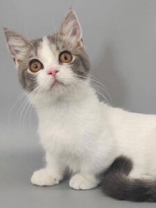 At just a few months old, Nixon Harris already displays the distinctive characteristics of Munchkin kittens with his luxurious long fur, tufted ears, and fluffy tail. His expressive eyes, a captivating shade of green, mirror his lively and inquisitive personality.