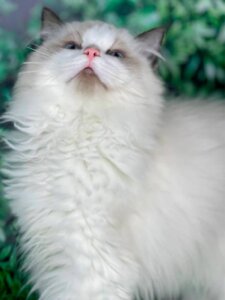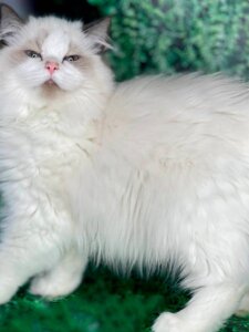 Sultan already displays the hallmark features of the Ragdoll breed. His plush coat, round face with chubby cheeks, and large, expressive eyes highlight his captivating looks.