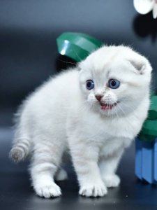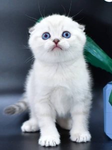 At just a few months old, Daniel already showcases all the hallmark features of the Scottish Fold kittens — including his round, plush face, velvety coat, and those endearing folded ears that make him look forever curious and content.